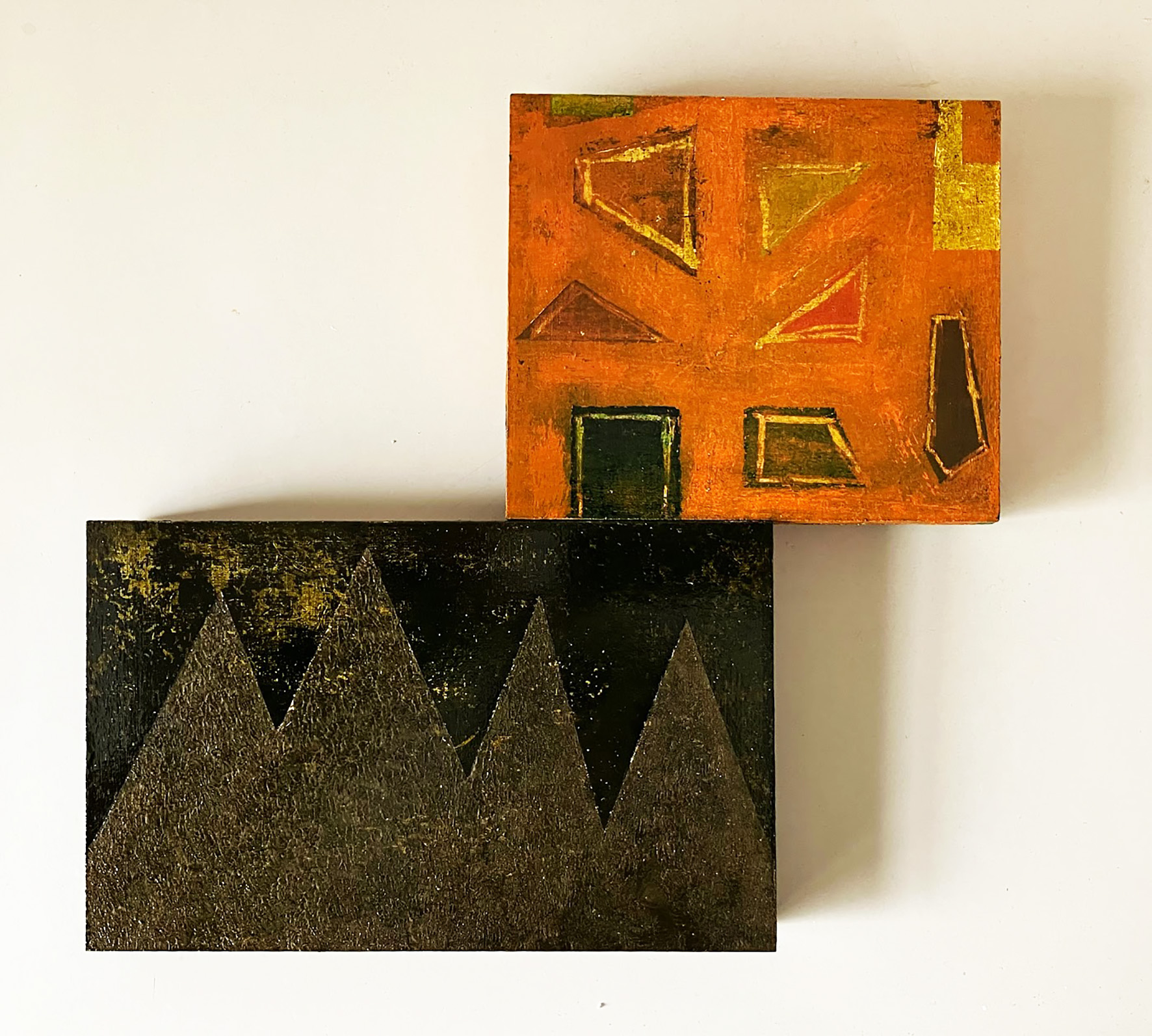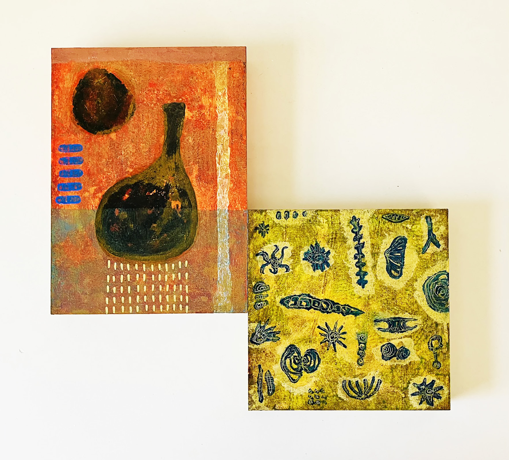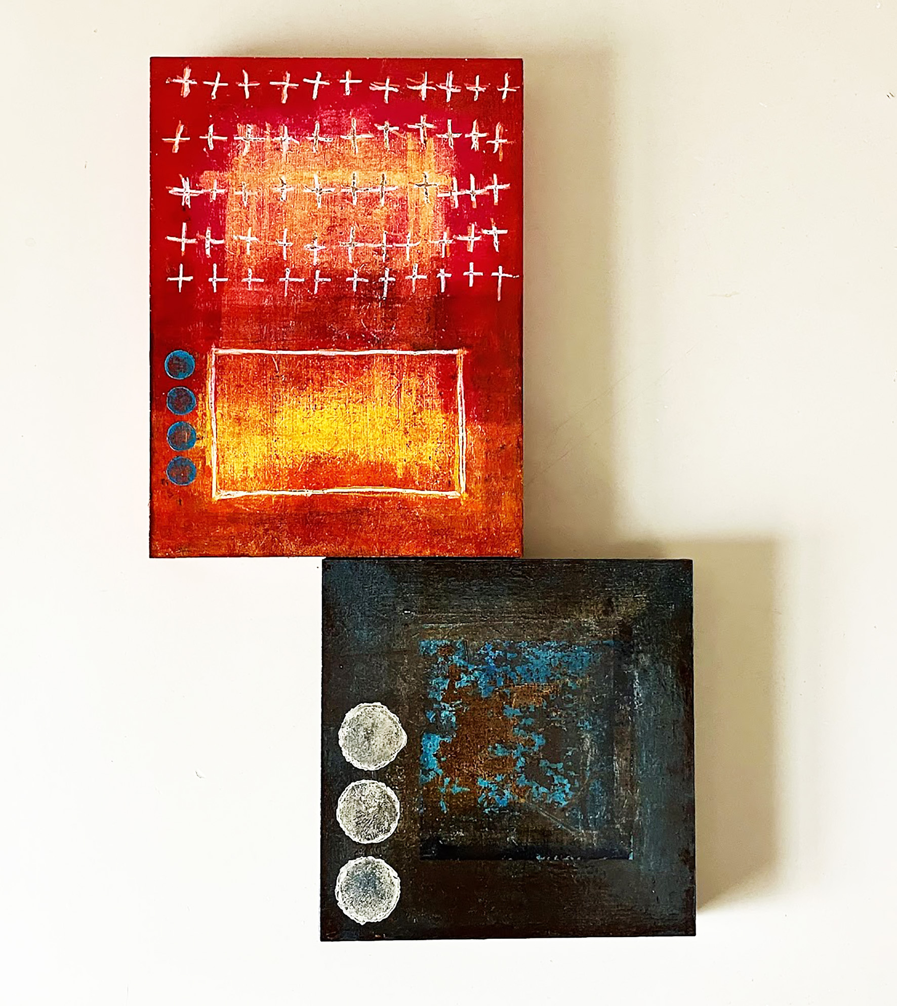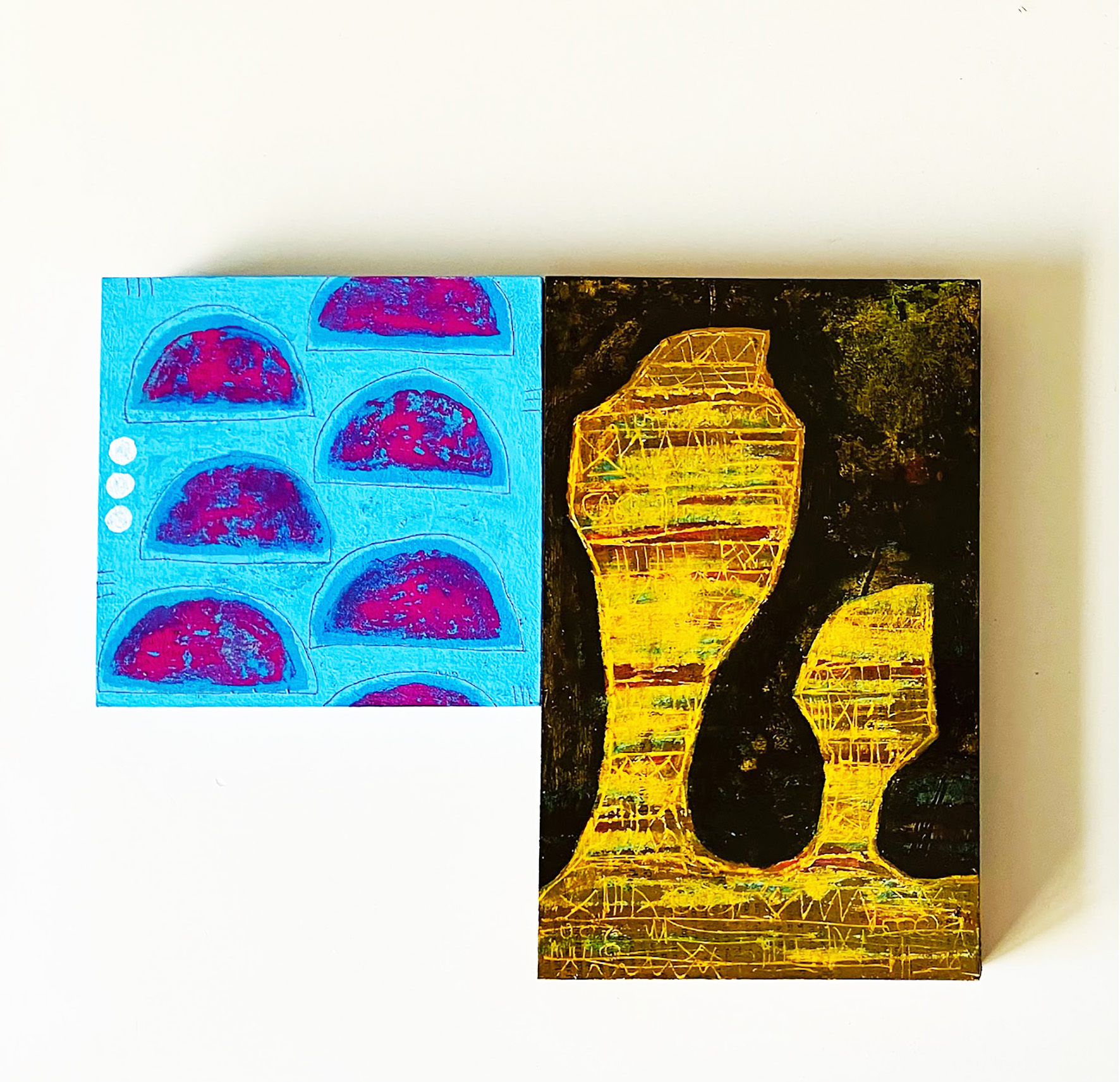 Dos piezas se juntan, formando un díptico, para resaltar la diversidad formal y conceptual, y jugar con el efecto espejo, el peso visual y el lenguaje poético del dibujo y sus significados. Medidas no superiores a los 35 cm, en cualquiera de sus dimensiones. Técnica mixta sobre tabla montada sobre bastidor de madera.