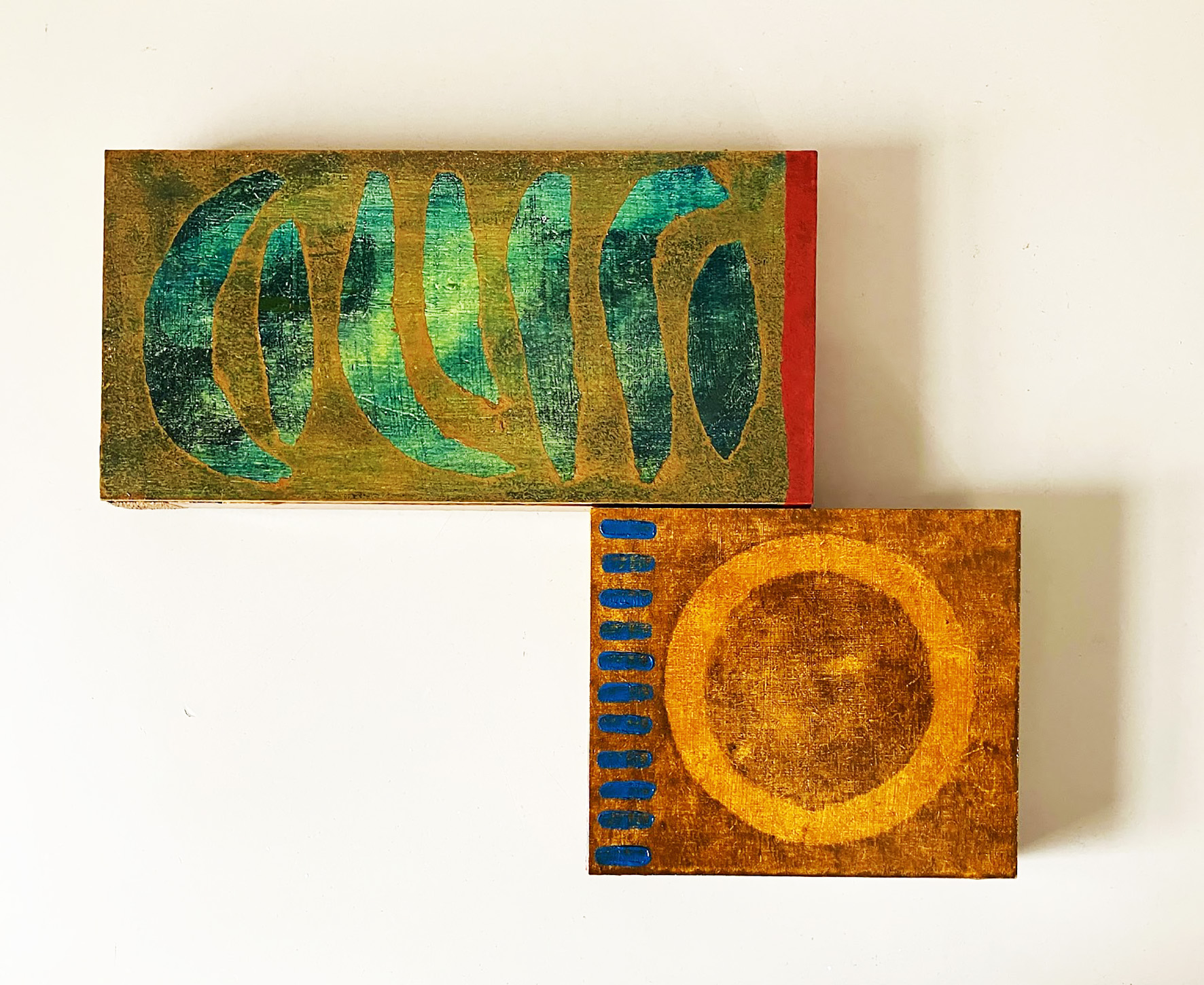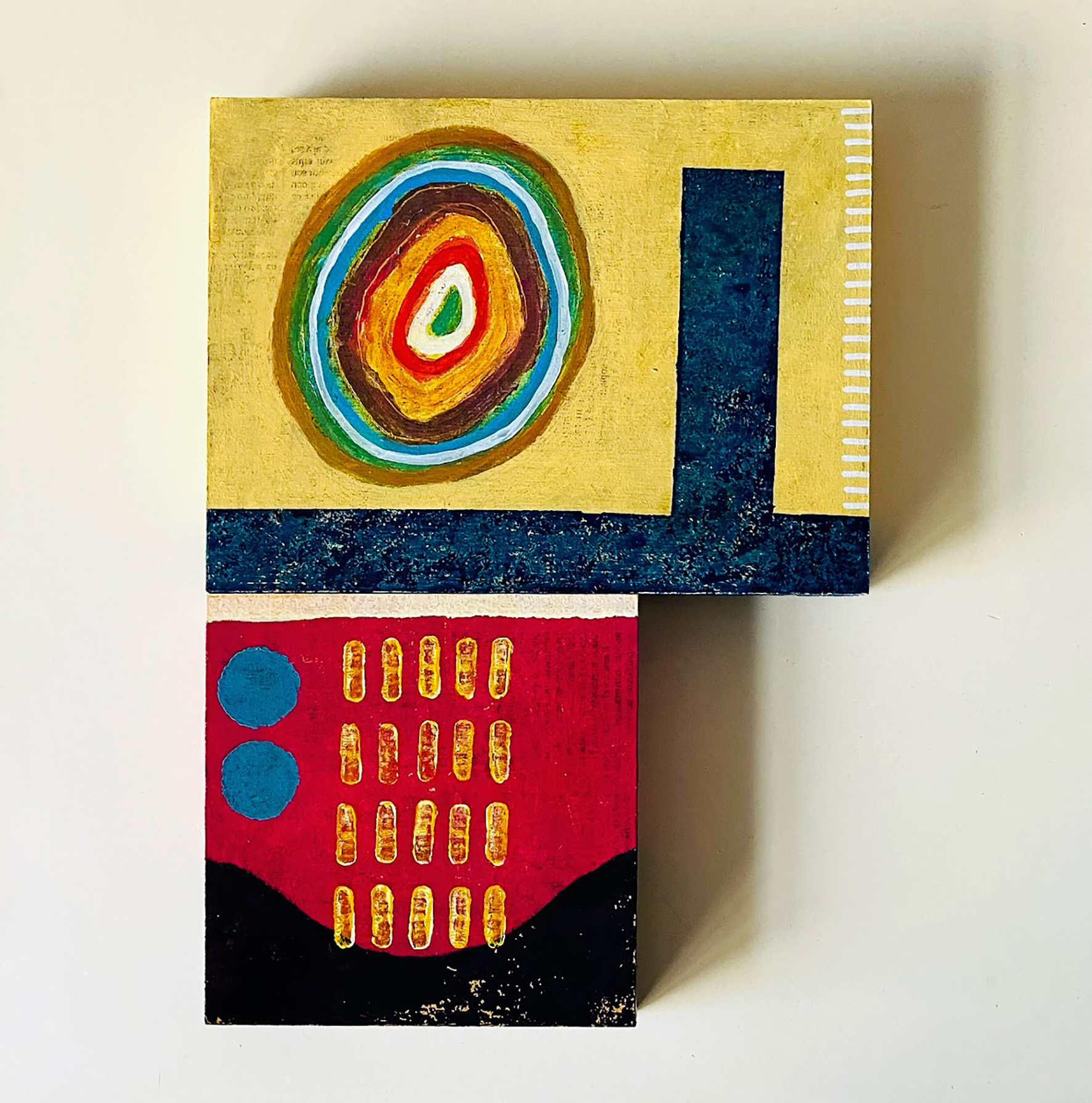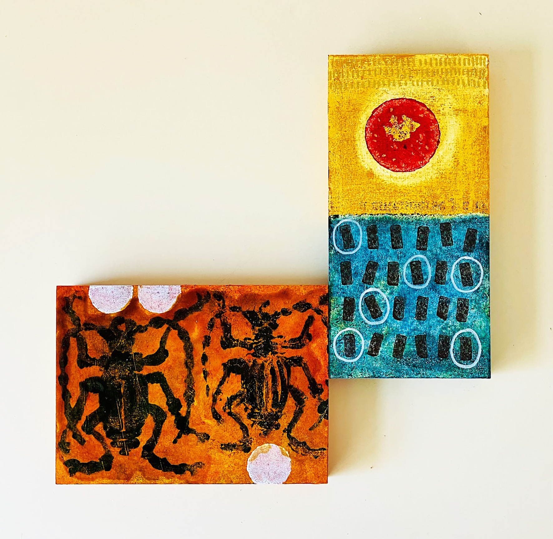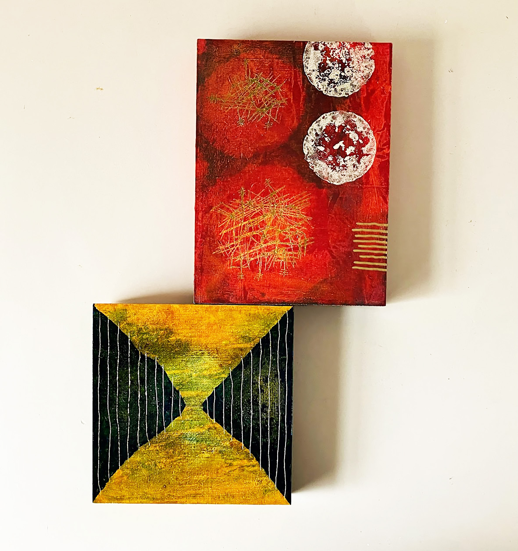 Dos piezas se juntan, formando un díptico, para resaltar la diversidad formal y conceptual, y jugar con el efecto espejo, el peso visual y el lenguaje poético del dibujo y sus significados. Medidas no superiores a los 35 cm, en cualquiera de sus dimensiones. Técnica mixta sobre tabla montada sobre bastidor de madera.
