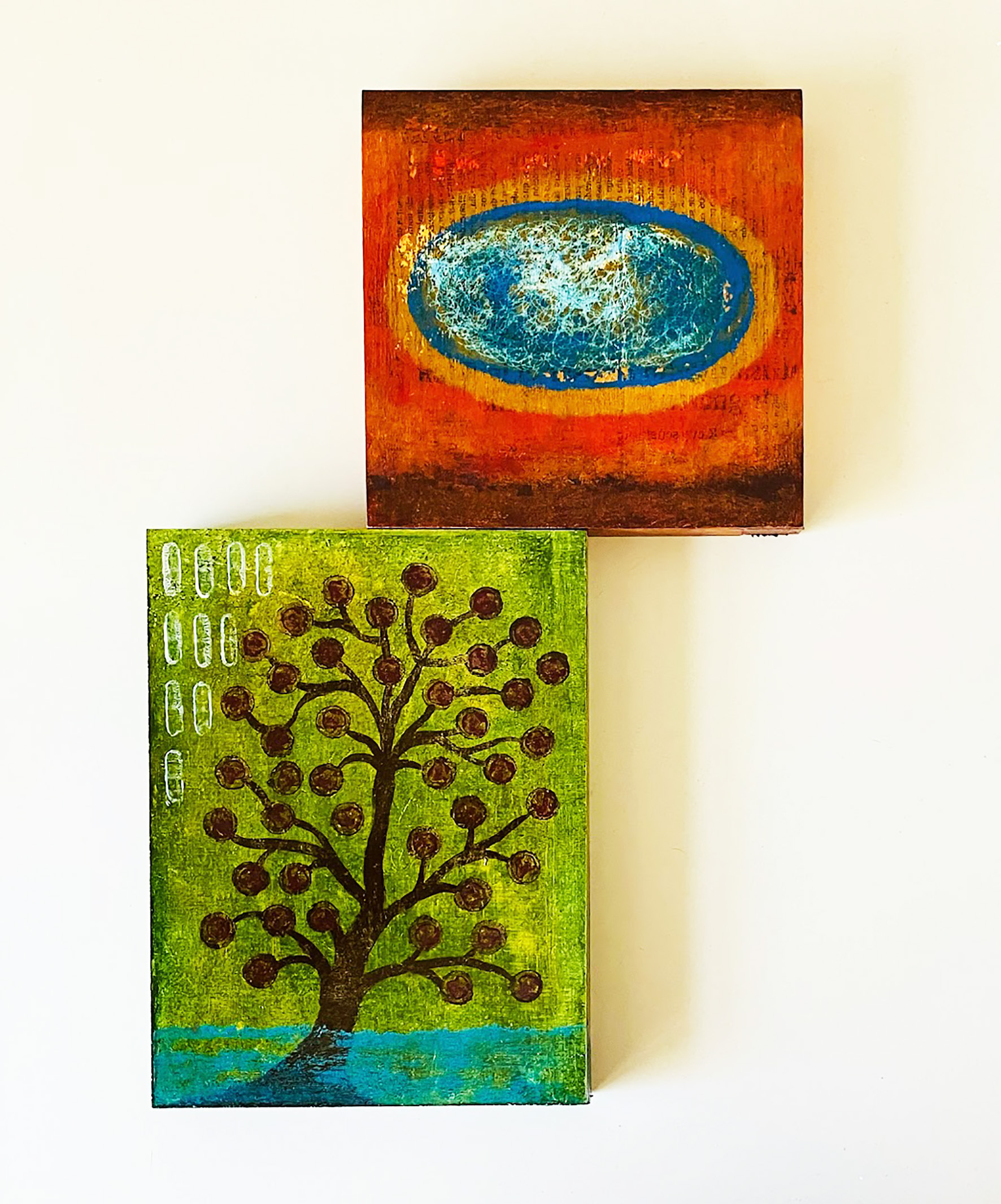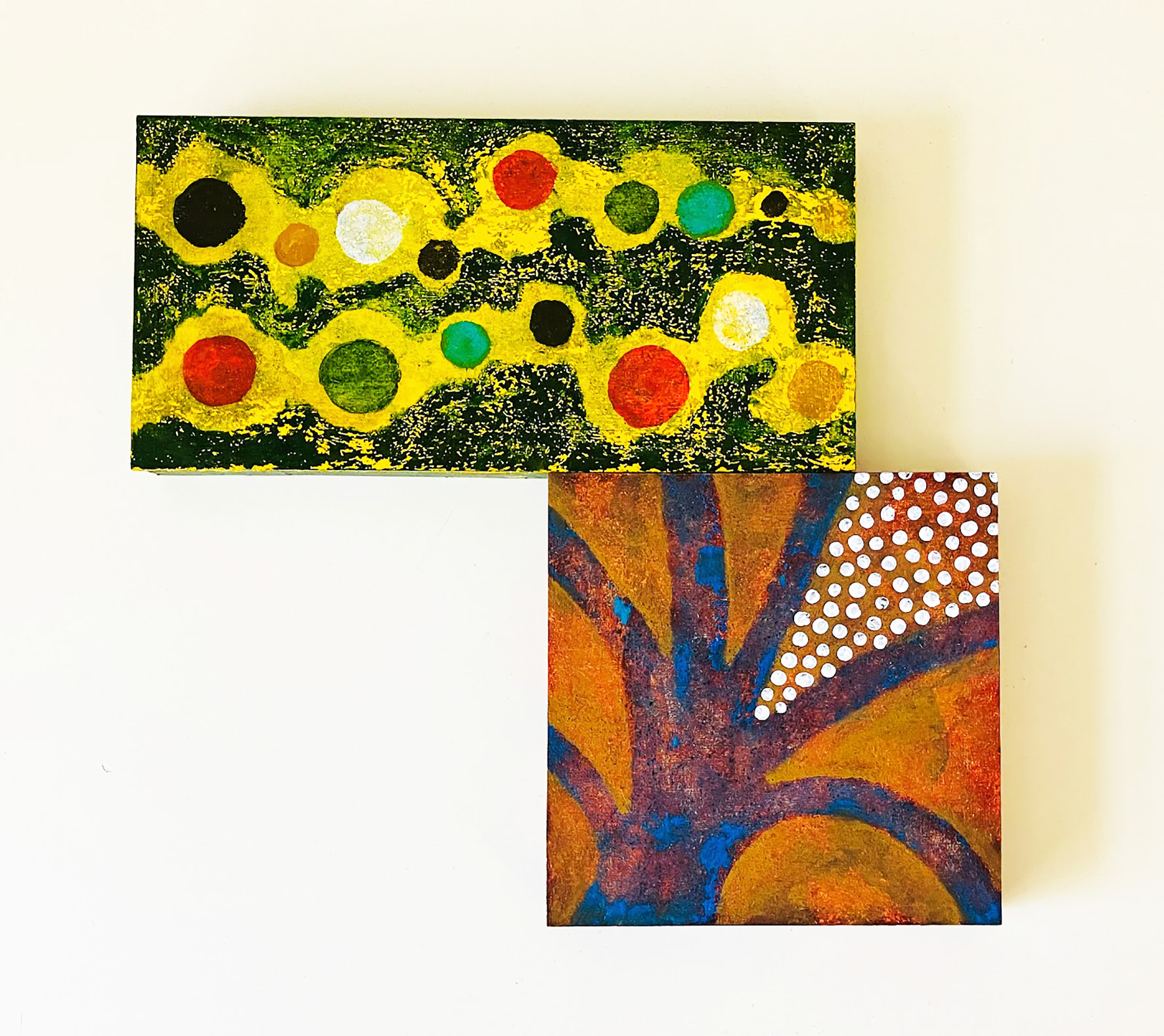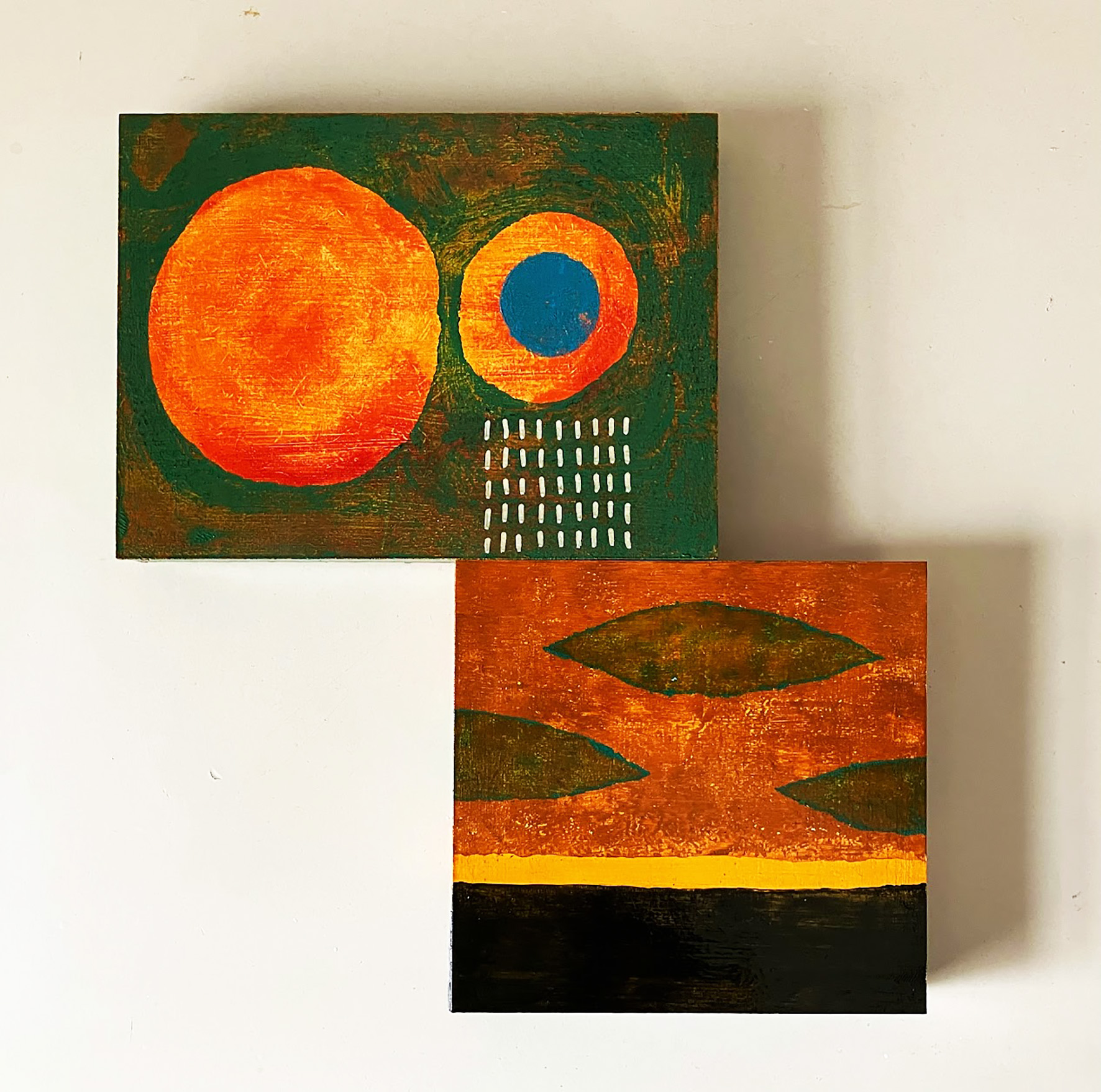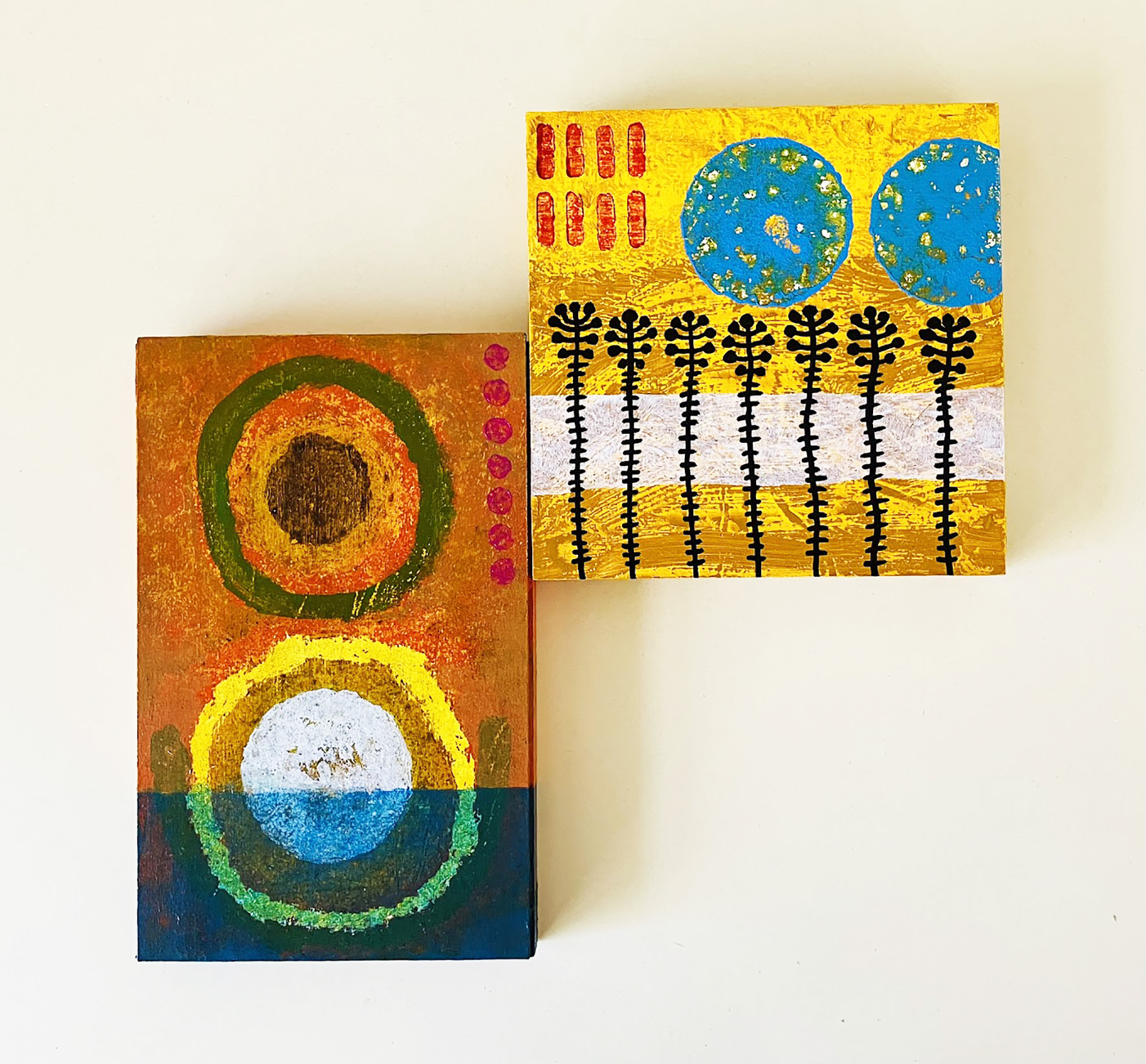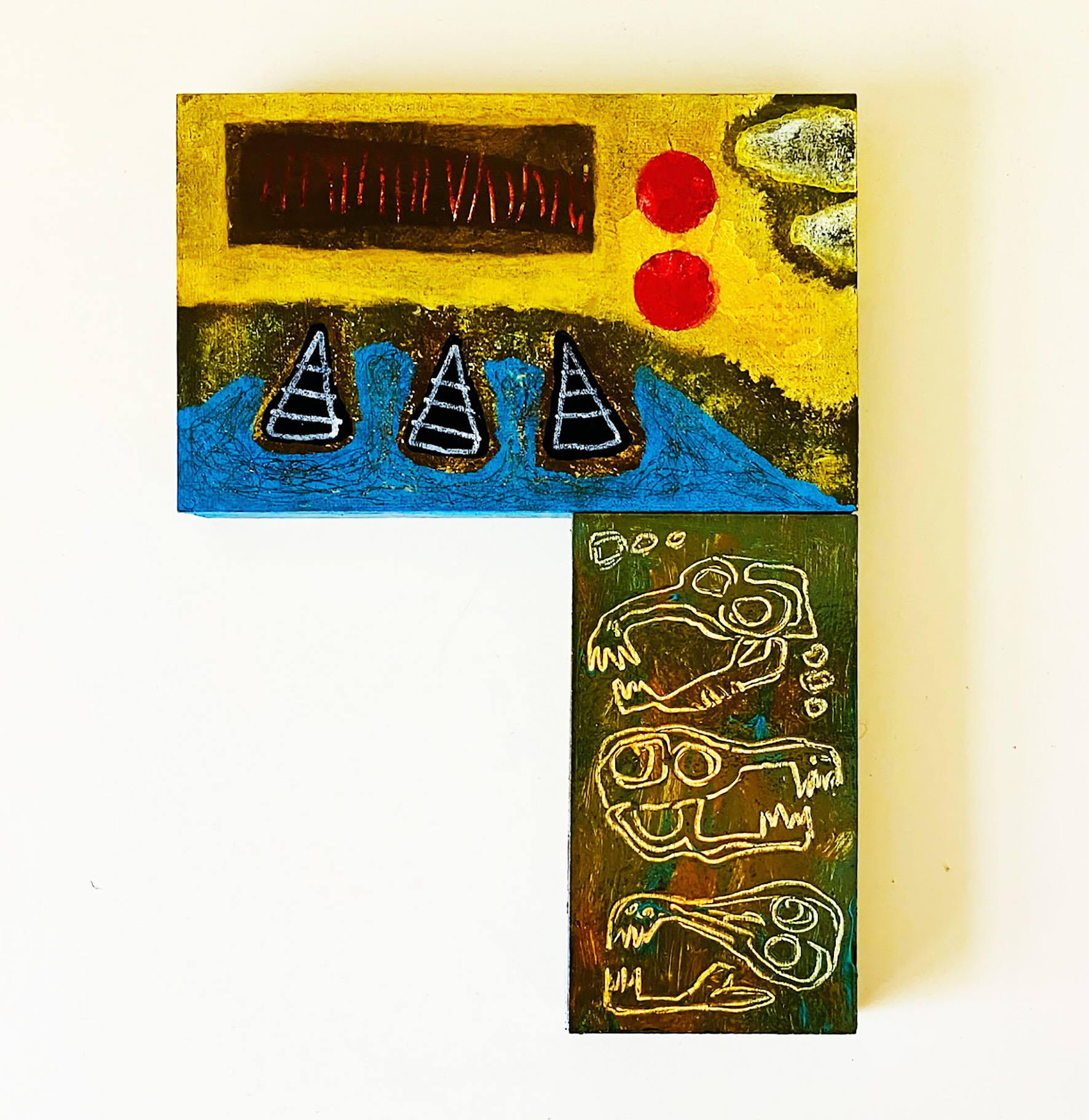 Dos piezas se juntan, formando un díptico, para resaltar la diversidad formal y conceptual, y jugar con el efecto espejo, el peso visual y el lenguaje poético del dibujo y sus significados. Medidas no superiores a los 35 cm, en cualquiera de sus dimensiones. Técnica mixta sobre tabla montada sobre bastidor de madera.