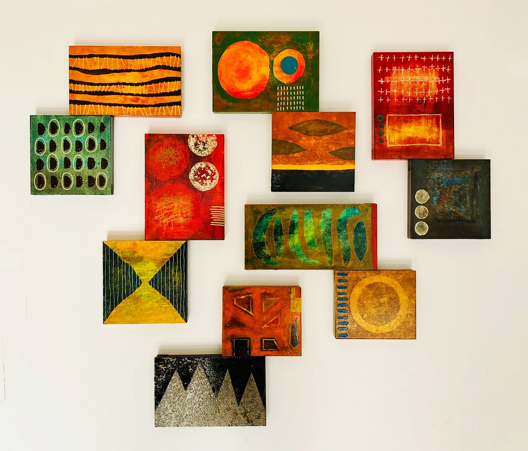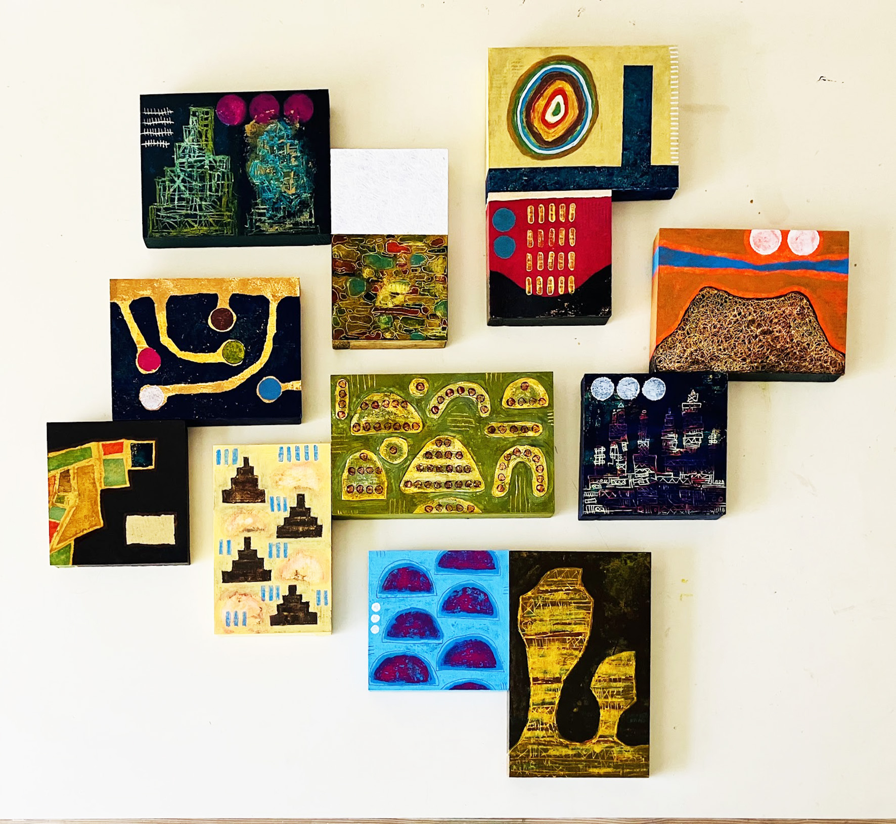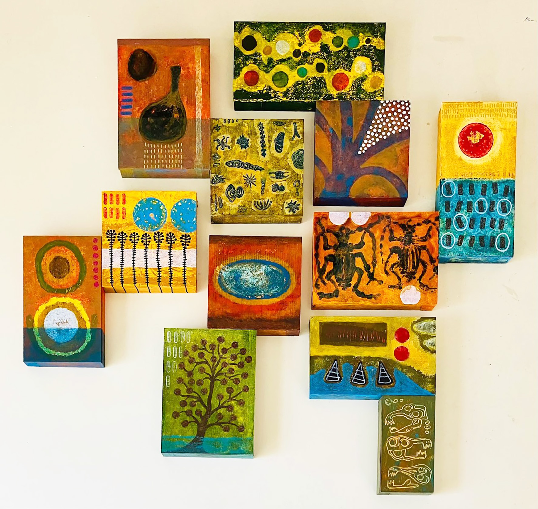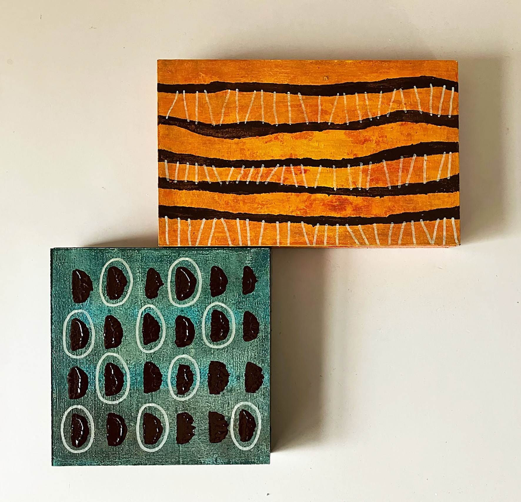 Dos piezas se juntan, formando un díptico, para resaltar la diversidad formal y conceptual, y jugar con el efecto espejo, el peso visual y el lenguaje poético del dibujo y sus significados. Medidas no superiores a los 35 cm, en cualquiera de sus dimensiones. Técnica mixta sobre tabla montada sobre bastidor de madera.